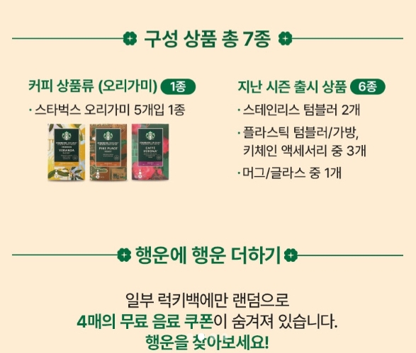 일부 럭키백에는 무료 음료 쿠폰 4매가 랜덤으로 포함됩니다. 모든 럭키백에 들어있는 것은 아니고 운이 좋아야 받을 수 있습니다.