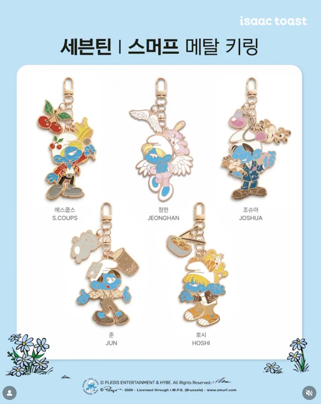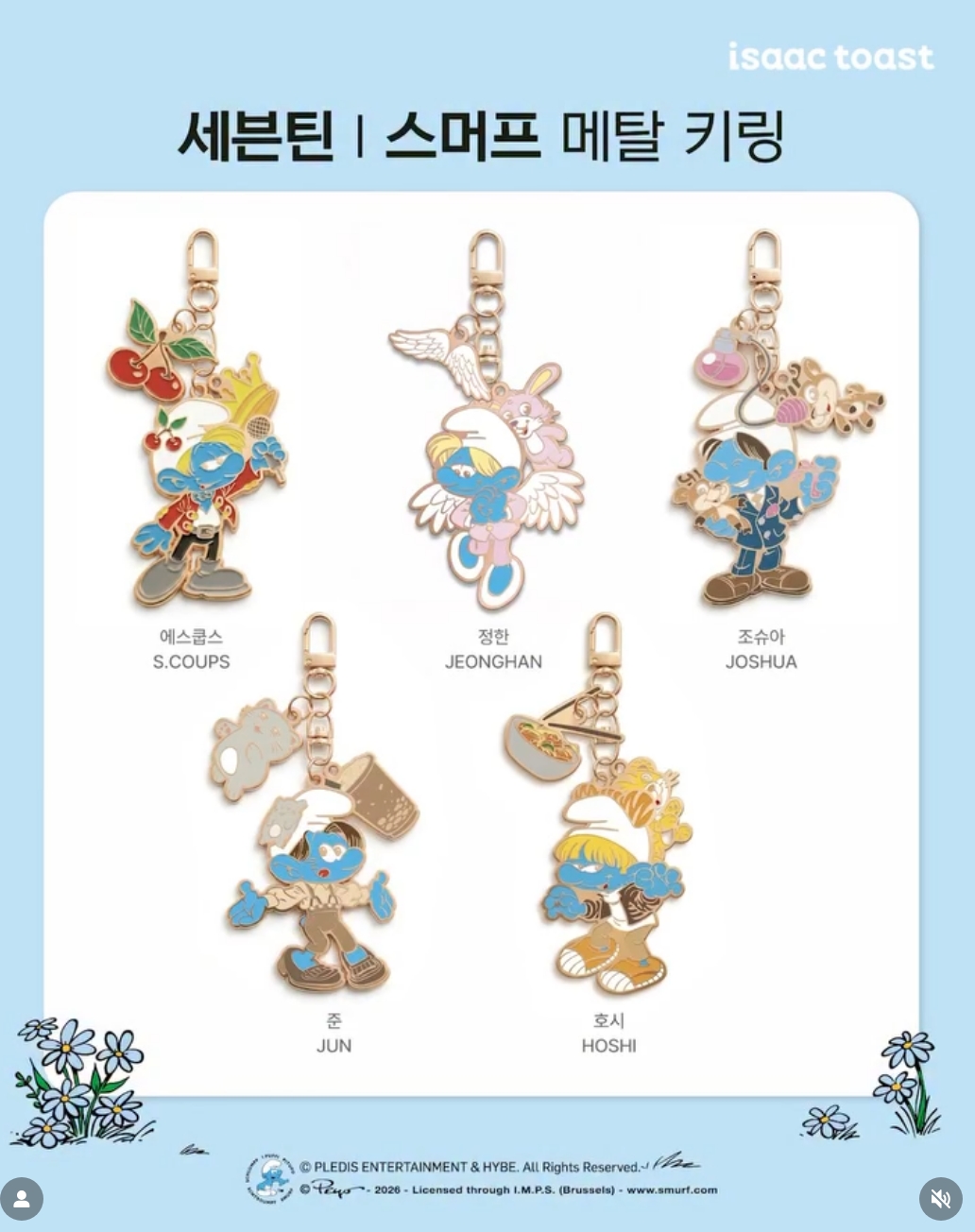 키링은 세븐틴 멤버 13명을 스머프 캐릭터로 만든 디자인입니다. 각 멤버의 특징을 살린 액세서리 참이 함께 달려 있어서 디테일이 좋습니다. 예를 들어 호시 키링에는 호랑이와 김치 모양 참이 달려 있습니다. 호시의 별명이 호랑이고 김치를 좋아한다는 걸 반영한 거죠. 우지 키링에는 기타 참이 붙어 있습니다. 세븐틴의 프로듀서이자 작곡가인 우지의 음악 활동을 나타냅니다.