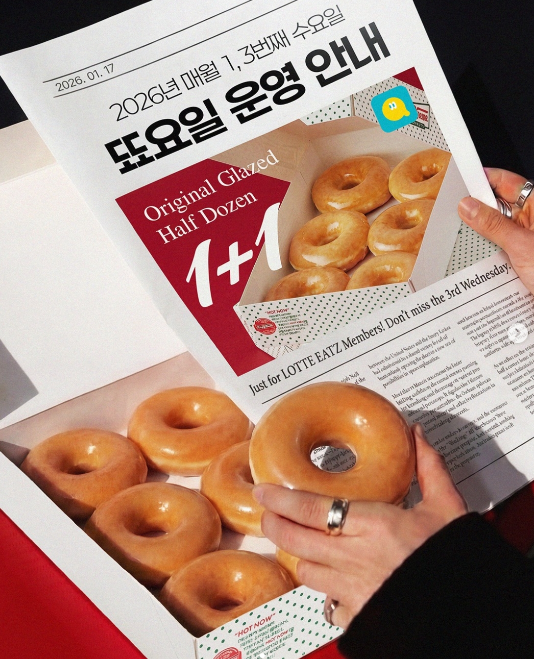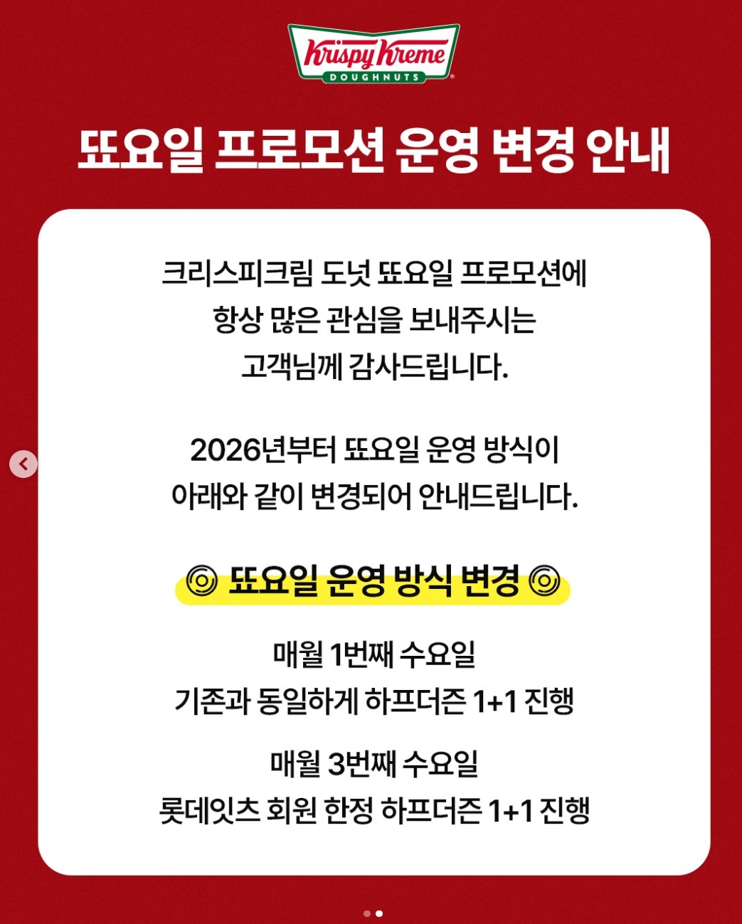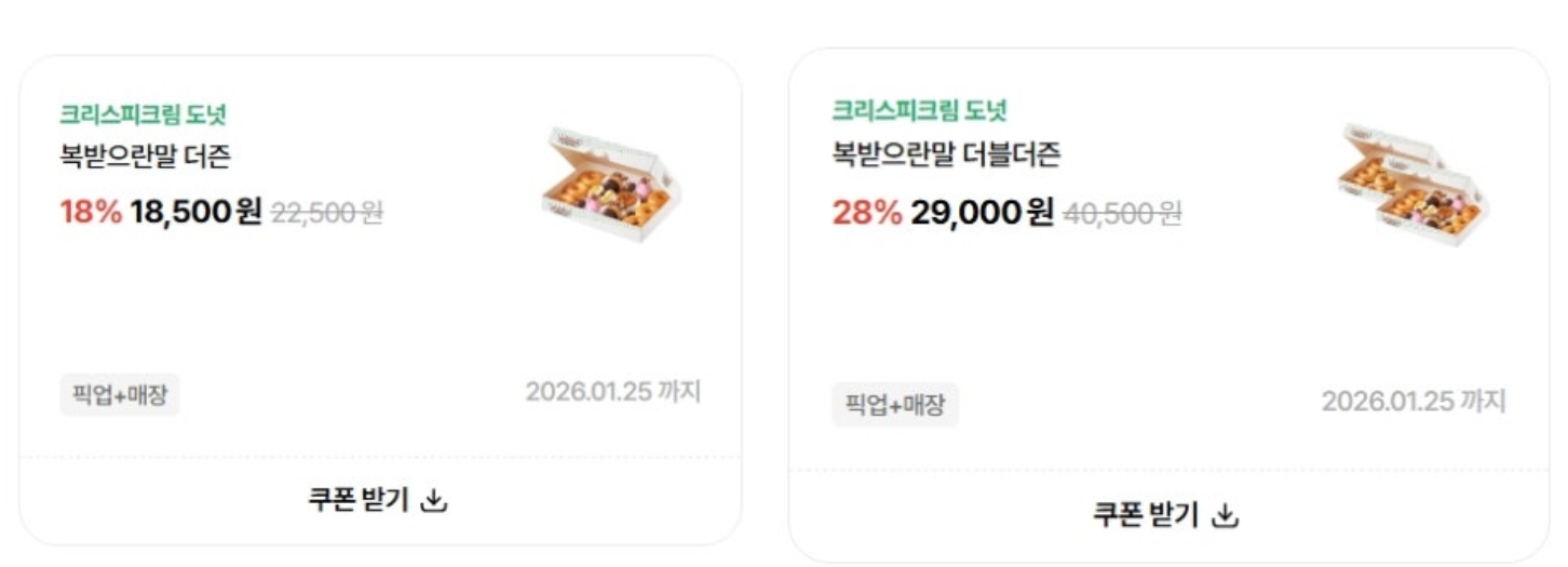 크리스피크림의 정기 프로모션 '달달한 수요일' 1+1 행사와 2026년 신년 한정 '복받으란말' 도넛 할인 정보를 정리했습니다. 롯데잇츠 회원 쿠폰으로 최대 11,500원까지 절약할 수 있습니다.