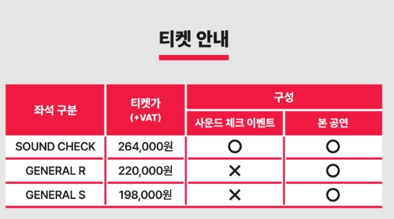 가장 궁금해하실 가격! 이번엔 '사운드 체크'석이 백미입니다. 리허설까지 볼 수 있어서 경쟁이 미칠 것 같아요.